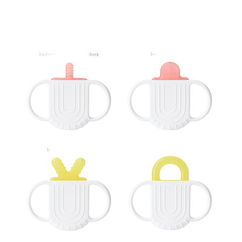 • 4 rôzne dizajny hryzátka pre rôzne obdobia rastu zúbkov (prvé dolné a horné jednotky, rezáky, stoličky)