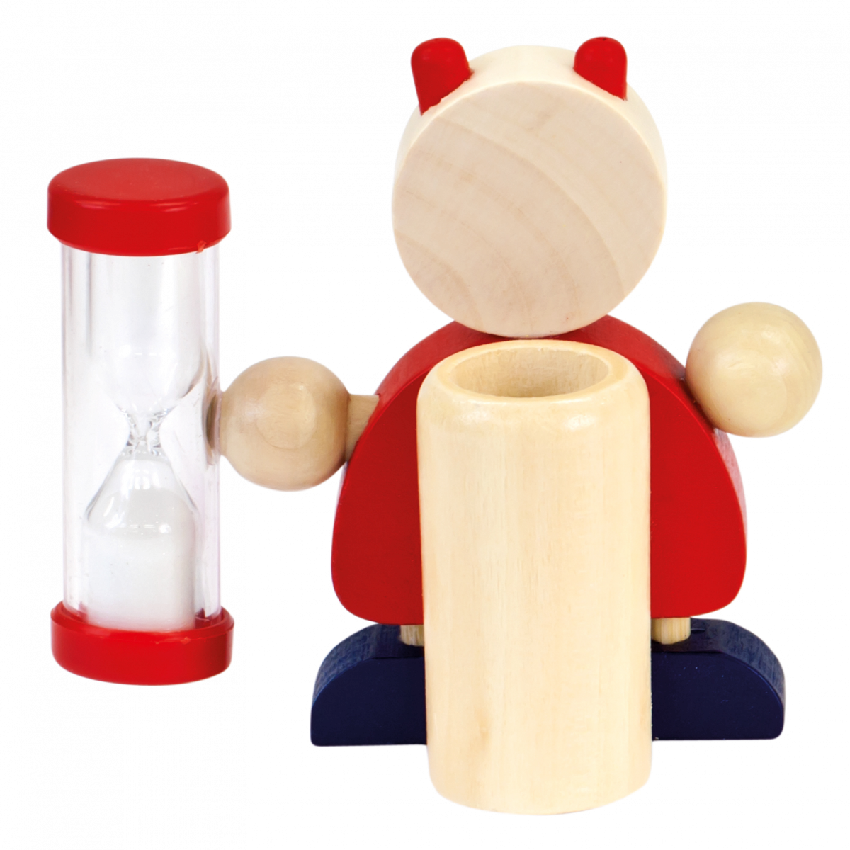 Drevený stojanček na zubnú kefku pre deti s presýpacími hodinami, ktoré odmerajú správny čas na čistenie zubov. Vyberte si medzi žabkou, lienkou a mačičkou.