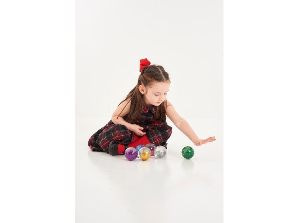 Deti sú fascinované trblietkami, ktoré vo vnútri gule po zatrepaní víria. Učia sa farby, precvičujú hmat.